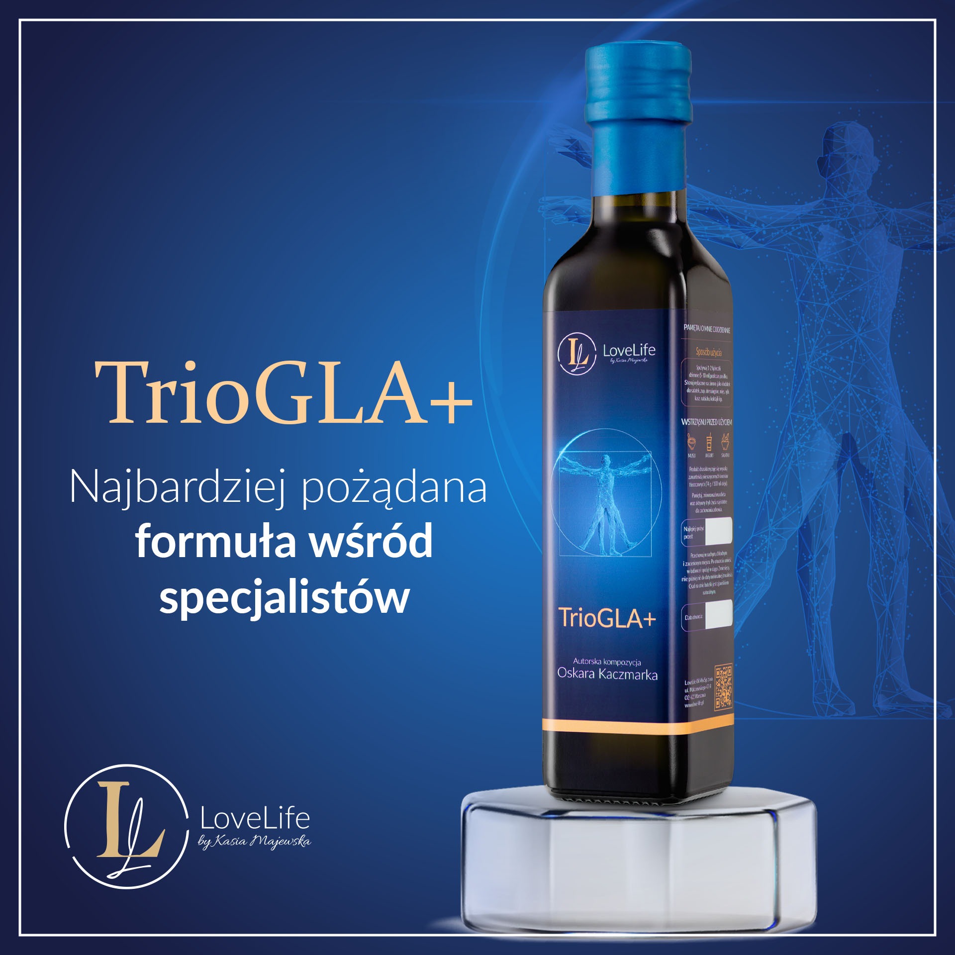 Zalecamy spożywanie 5-10 ml oleju dziennie, najlepiej podczas posiłków serwowanych na zimno. TrioGLA+ w indywidualnie dostosowanej dawce (2,5-5ml) jest odpowiedni dla dzieci powyżej 3 roku życia.Producent: